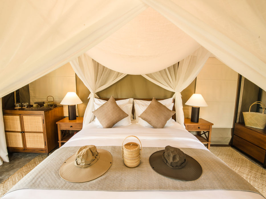Our Deluxe Tent feels both intimate and airy. Raised on a hardwood platform, each tent is angled to catch the prevailing breeze, and with the addition of air conditioner remain cool. Twin or king beds are draped with Khmer cotton and sit beneath a teak headboard.