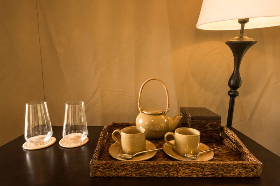 Our long skein of suite tents survey the flower meadow and moat towards the open forest. For a true sense of luxury, the spacious suite tent offers a palatial four-poster bed and opulent sofa area, making guests feel like royalty on campaign.